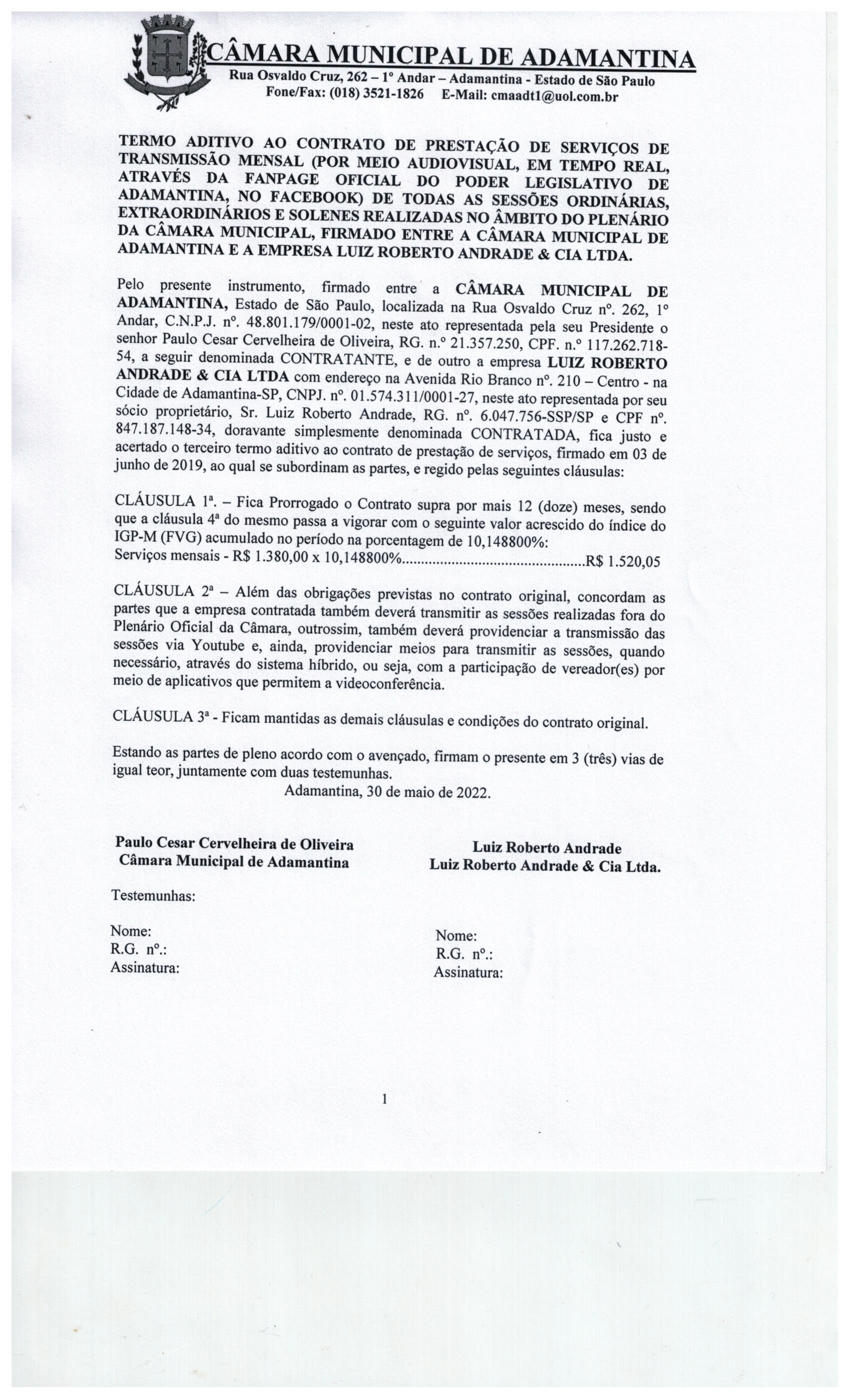 Fica prorrogado por mais 12 meses o contrato entre esta Câmara Municipal e a Empresa Luiz Roberto Andrade & Cia Ltda, passando também a vigorar com o seguinte valor mensal: 1.520,05, bem como fica acordado que além das obrigações previstas no contrato original, a contratada também deverá transmitir as sessões realizadas fora do Plenário Oficial da Câmara, providenciar a transmissão via Youtube e quando for necessário, através do sistema híbrido quando a participação de vereador(es) se der por meio de videoconferência. - (Fiscal do Contrato/Termo Aditivo: Glauce Martins Barbaroto)